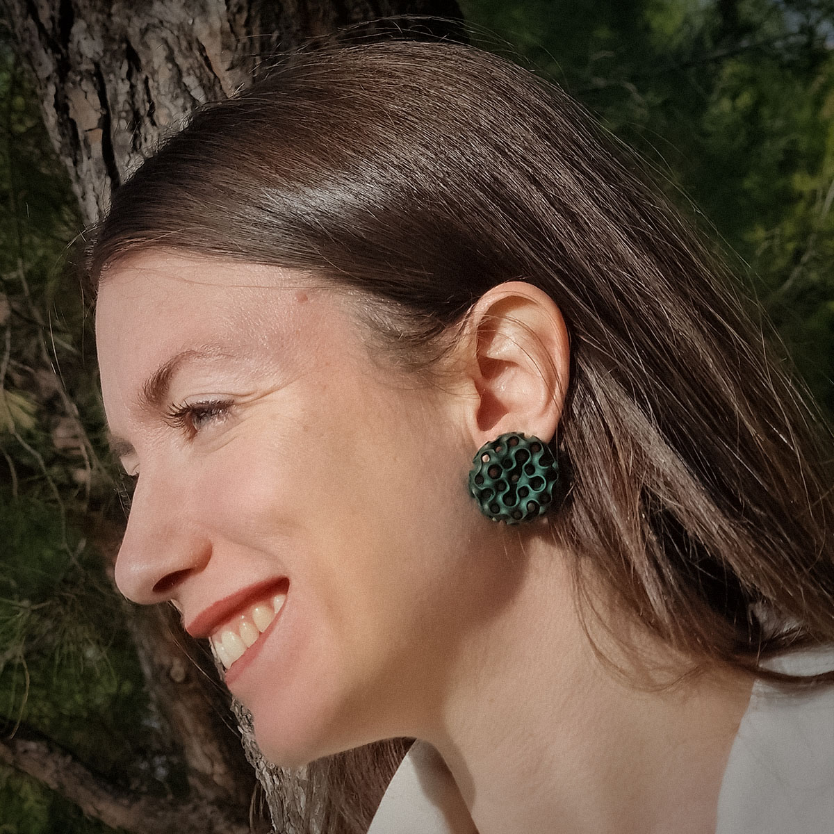 Pendientes impresos en 3D en verde bosque un color lleno de luz.