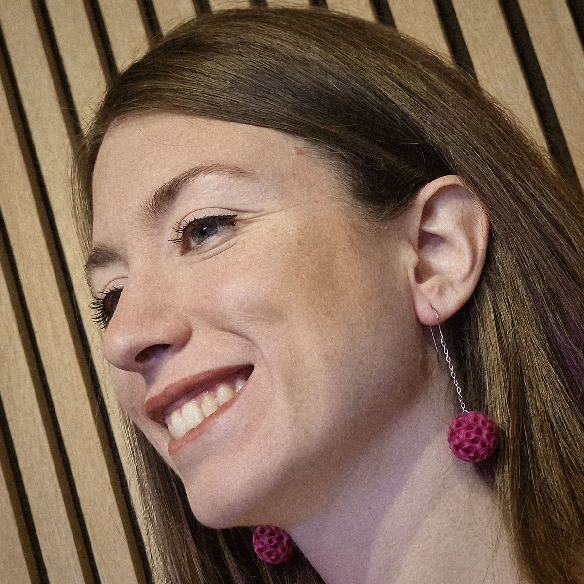 Pendientes ultraligeros en Magenta Real, impresos en 3D y ensamblados con titanio biocompatible.
